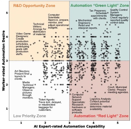 Bu soruları yanıtlamak için, Stanford İnsan Merkezli Yapay Zeka Enstitüsü ve Dijital Ekonomi Laboratuvarı araştırmacıları, ABD’li çalışanlar ve yapay zeka uzmanları üzerinde kapsamlı bir çalışma yürüttüler. Yapay zeka ajanlarının işe hangi noktalarda fayda sağlayabileceğini ve hangi noktalarda zarar verebileceğini belirlemek için 1.500 çalışana anket uyguladılar ve teknolojinin mevcut yeteneklerini daha iyi anlamak için 52 yapay zeka uzmanıyla görüştüler. Araştırmacılar daha sonra, otomasyon için yeniden değerlendirilmesi gereken fırsatları ve görevleri belirlemek amacıyla çalışanların isteklerini yapay zeka yetenekleriyle birlikte grafiklendirdiler.