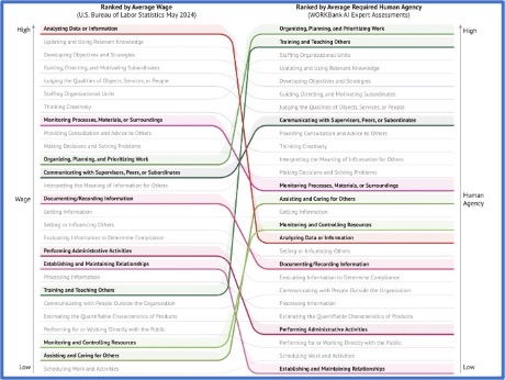 Ortalama ücret ve gerekli insan gücüne göre beceri sıralamalarının karşılaştırılması, değerli insan yeteneklerinde bilgi işleme becerilerinden kişilerarası becerilere doğru potansiyel bir değişim olduğunu ortaya koyuyor.
