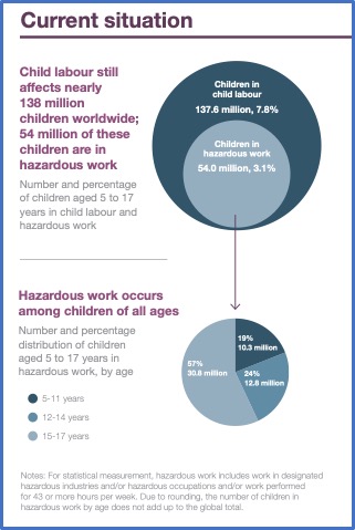 Çocuk işçilik dünyada 138 Milyon çocuğu etkşlemektedir. 54 Milyon çocuk tehlikeli işlerde çalışmaktadır. Tehlikeli işlerde çalışan çocuklar tüm yaş guruplarını temsil etmektedir.