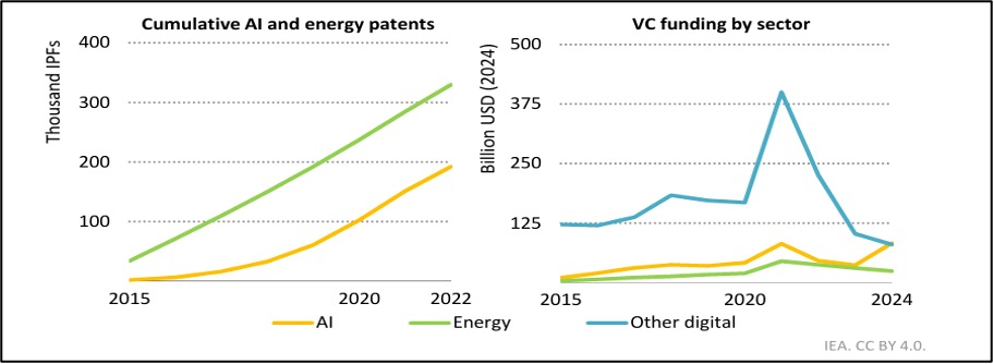 Buna karşılık, ticarileşme konusuna ve bunun bir göstergesi olarak risk sermayesi akışına bakıldığında farklı bir durum ortaya çıkmaktadır. Enerji alanındaki risk sermayesi YZ sektörüne yönelen risk sermayesinin çok gerisinde kalmıştır. 2024’te enerjiye giden risk sermayesi azalırken toplam risk sermayesi yatırımlarının üçte biri YZ start-up firmalarına yönelmiştir. Genel dijital sektör dikkate alındığında bu fark daha da açılmaktadır.