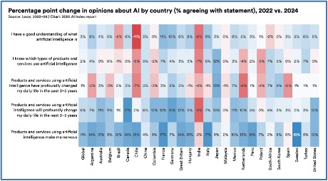 Ipsos’un 2022 ve 2024’te anket yaptığı 26 ülke arasında 18’inde, yapay zeka ürün ve hizmetlerinin dezavantajlarından daha fazla fayda sağladığına inananların oranında artış görüldü. Küresel olarak, yapay zeka ürün ve hizmetlerini zararlı olmaktan çok faydalı gören bireylerin oranı 2022’de %52’den 2024’te %55’e yükseldi.
