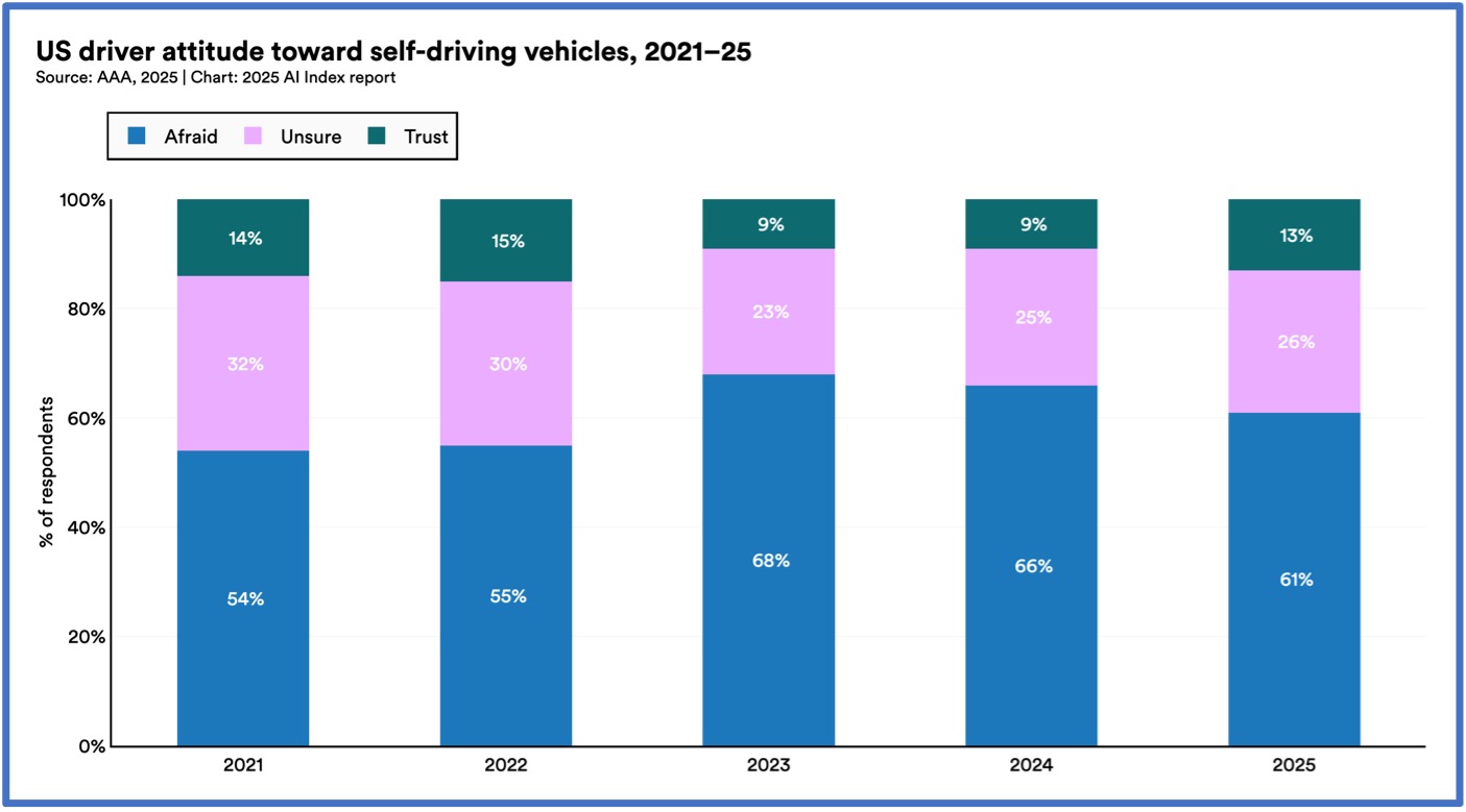 Yakın zamanda yapılan bir Amerikan Otomobil Derneği anketi, ABD’deki insanların %61’inin otonom araçlardan korktuğunu ve yalnızca %13’ünün onlara güvendiğini ortaya koydu. Korku ifade edenlerin yüzdesi 2023’teki %68’lik zirveden düşse de, 2021’dekinden (%54) daha yüksek kalmaya devam ediyor.