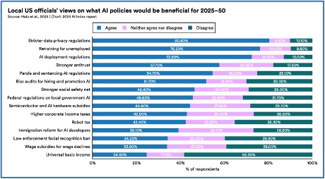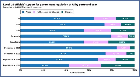 2023 yılında, kasaba, belediye ve ilçe düzeylerinde yerel ABD politikacılarının %73,7’si yapay zekanın düzenlenmesi gerektiği konusunda hemfikirdi; bu oran 2022’deki %55,7’den önemli ölçüde arttı. Demokratlar (%79,2) arasında destek, Cumhuriyetçiler (%55,5) arasında destekten daha güçlüydü; ancak her ikisinde de 2022’ye göre önemli artışlar kaydedildi.