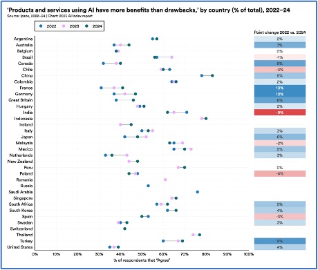 Küresel olarak, AI ürünleri ve hizmetlerine ilişkin iyimserlik arttı ve en keskin kazanımlar daha önce en şüpheci olan ülkelerde görüldü. 2022’de Büyük Britanya (%38), Almanya (%37), Amerika Birleşik Devletleri (%35), Kanada (%32) ve Fransa (%31), AI’nın dezavantajlarından daha fazla faydası olduğunu düşünme olasılığı en düşük olanlar arasındaydı. O zamandan beri, bu ülkelerde iyimserlik sırasıyla %8, %10, %4, %8 ve %10 arttı.