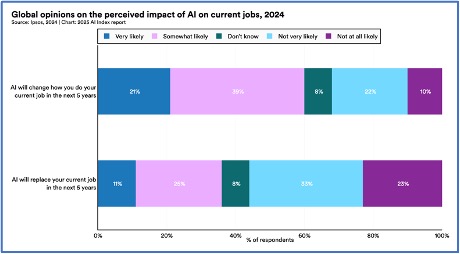Küresel olarak, katılımcıların %60’ı AI’nın önümüzdeki beş yıl içinde bireylerin işlerini yapma biçimlerini değiştireceği konusunda hemfikir. Ancak, katılımcıların daha küçük bir alt kümesi, %36, AI’nın önümüzdeki beş yıl içinde işlerini değiştireceğine inanıyor.