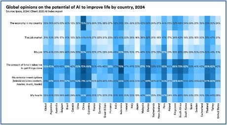 Yapay zekanın etkisine dair küresel bakış açıları çeşitlilik göstermektedir. %55’i zamandan tasarruf sağlayacağına inanırken, %51’i daha iyi eğlence seçenekleri sunacağını beklerken, daha azı sağlık veya ekonomik faydalarına güveniyor. Sadece %38’i yapay zekanın sağlığı iyileştireceğini düşünürken, %36’sı yapay zekanın ulusal ekonomiyi iyileştireceğini düşünüyor, %31’i iş piyasasında olumlu bir etki görüyor ve %37’si kendi işlerini iyileştireceğine inanıyor.