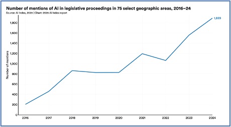 75 büyük ülkede, yasama süreçlerinde yapay zekaya ilişkin atıflar 2023’teki 1.557’den 2024’te %21,3 artarak 1.889’a yükseldi. 2016’dan bu yana yapay zekaya ilişkin atıfların toplam sayısı dokuz kattan fazla arttı.