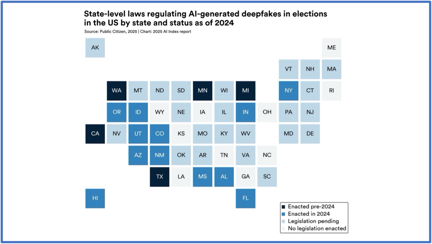 2024’ten önce, yalnızca beş eyalet—California, Michigan, Washington, Texas ve Minnesota—seçimlerde deepfake’leri düzenleyen yasalar çıkarmıştı. 2024’te, Oregon, New Mexico ve New York dahil 15 eyalet daha benzer önlemler getirdi. Ek olarak, 2024’e kadar 24 eyalet deepfake’leri hedef alan düzenlemeler çıkarmıştı.