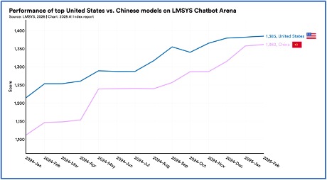 Geçtiğimiz yılın YZ Endeksi’ne göre, Chatbot Arena Liderlik Tablosu’nda en üst ve 10. sıradaki model arasındaki Elo puanı farkı %11,9’du. 2025’in başlarında bu fark sadece %5,4’e düştü. Benzer şekilde, en üst iki model arasındaki fark 2023’teki %4,9’dan 2024’te sadece %0,7’ye düştü. YZ manzarası giderek daha rekabetçi hale geliyor ve artık artan sayıda geliştiriciden yüksek kaliteli modeller elde edilebiliyor.