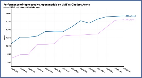 Geçtiğimiz yılki YZ Endeksi, önde gelen açık ağırlık modellerinin kapalı ağırlık emsallerinin önemli ölçüde gerisinde kaldığını ortaya koydu. 2024’e gelindiğinde bu fark neredeyse ortadan kalkmıştı. Ocak 2024’ün başlarında önde gelen kapalı ağırlık modeli, Chatbot Arena Liderlik Tablosu’nda en iyi açık ağırlık modelini %8,04 oranında geride bıraktı. Şubat 2025’e gelindiğinde bu fark %1,70’e düştü.
