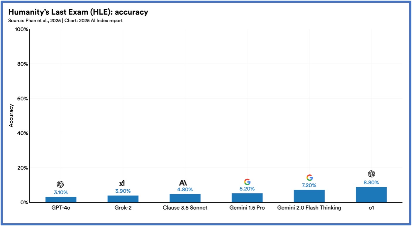 MMLU, GSM8K ve HumanEval gibi geleneksel YZ kıyaslamalarının doygunluğu, MMMU ve GPQA gibi daha yeni ve daha zorlu kıyaslamalarda iyileştirilmiş performansla birleştiğinde, araştırmacıları önde gelen YZ sistemleri için ek değerlendirme yöntemleri keşfetmeye itti. Bunlar arasında en dikkat çekenler, en iyi sistemin sadece %8,80 puan aldığı zorlu bir akademik sınav olan Humanity’s Last Exam; YZ sistemlerinin problemlerin sadece %2’sini çözdüğü karmaşık bir matematik kıyaslaması olan FrontierMath; ve YZ sistemlerinin %35,5 başarı oranına ulaştığı bir kodlama kıyaslaması olan BigCodeBench’tir; bu, %97’lik insan standardının çok altındadır.