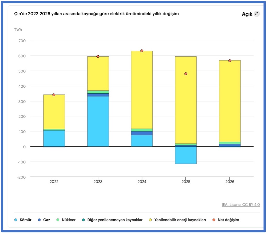 2026 yılına gelindiğinde, yenilenebilir enerji kaynaklarındaki yükseliş trendinin devam etmesi bekleniyor. Güneş fotovoltaik ve rüzgar enerjisi üretiminin sırasıyla %27 ve %19 oranında büyümesi öngörülüyor. Kömür yakıtlı üretimin genel olarak istikrarlı kalması beklenirken, nükleer enerji üretiminin %3 oranında büyümesi öngörülüyor. Çin’de gaz yakıtlı üretimin güçlü seyrini koruması ve 2025-2026 döneminde ortalama %3,6 oranında artması bekleniyor.