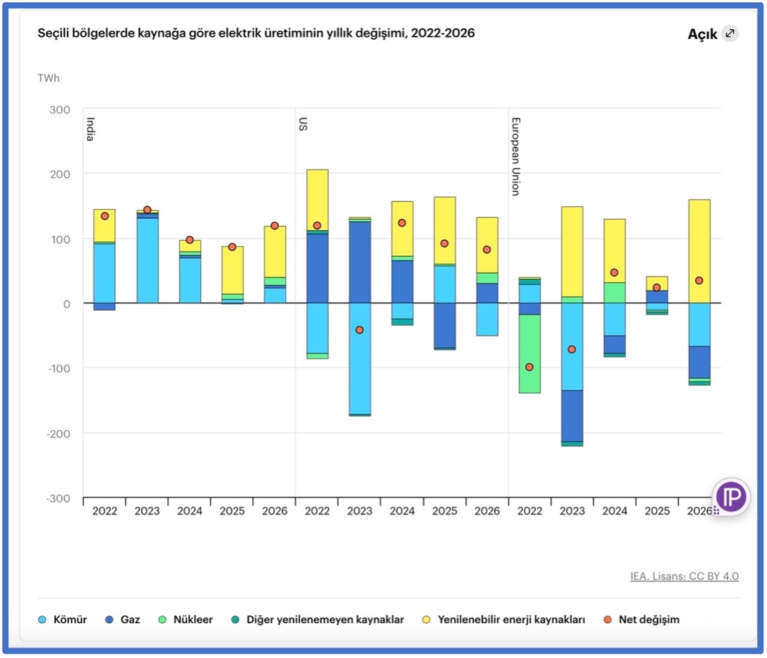 2025 yılı için gazla çalışan üretimin %3,6 oranında düşmesi ve 2026 yılında %1,6’lık büyümeye gerilemesi, güç karışımındaki payının ise %40’ın üzerinde kalması öngörülüyor. Kömürle çalışan üretimin 2025 yılında %8 oranında artması ve 2026 yılında yaklaşık %6,5 oranında düşmesi öngörülüyor. Nükleer üretimin 2025 yılında genel olarak sabit kalması, ardından 2026 yılında %2’lik bir büyüme kaydetmesi bekleniyor. Yenilenebilir enerji kaynaklarının 2025 yılında yaklaşık %10 ve 2026 yılında %7,5 oranında büyümeye devam etmesi öngörülüyor. Güneş PV’nin 2025 yılında %26 ve 2026 yılında %18 büyümeyle bu büyümeye öncülük etmesi ve yeni güç üretimine en büyük katkıyı sağlaması bekleniyor. Rüzgar üretiminin 2025 yılında yaklaşık %5 ve 2026 yılında %2 oranında artması öngörülüyor.