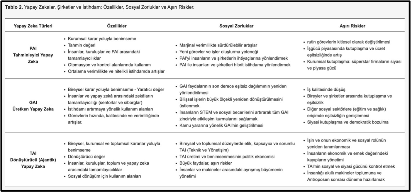 Yetenekleri genişledikçe, tahmine dayalı, üretken ve dönüştürücü yapay zekâlar giderek artan sayıda insan becerisini taklit ederek, rutin olmayan bilişsel işlerin yerini alma potansiyellerini hızlandırıyor. Teknik olarak, fikir üretebilen, yenilikler yaratabilen ve ekonomik büyümeyi insan emeğinden ayırabilen TAI’nin ortaya çıkışı önümüzdeki on yıllarda gerçekleşebilir [ 18 ]. Bu tür TAI varoluşsal bir risk oluşturmaktadır: tahmin, yaratım ve dönüşümdeki üstünlüğü, özellikle iş olmak üzere birçok sosyal alanda insanları gereksiz hale getirebilecek ekonomik bir avantaj sağlayacaktır [ 19 ]. Bu, yapay zekâyı insan ilerlemesinden uzaklaştırarak, PAI ve GAI ile zaten gözlemlenen otomasyon zorluklarını, yetersiz kontrolü, kutuplaşmayı ve eşitsizliği daha da kötüleştirecektir. Bununla birlikte, TAI insan ve örgütsel refaha yönelik olarak hizalanır ve yönlendirilirse, üretkenliği, ekonomik genişlemeyi, sosyal refahı ve çevre korumasını artırma kapasitesiyle yeni bir büyüme ve sosyal refah çağı yaratabilir [ 20 ].