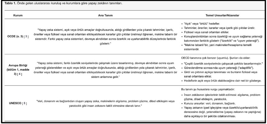 Yapay zekâ, tanımı uluslararası kuruluşlar arasında tartışılan dinamik bir kavramdır. Ekonomik İşbirliği ve Kalkınma Örgütü (OECD) [ 3 ] ve Avrupa Birliği, Yapay Zekâ Yasası’nda [ 4 ] yapay zekâyı “çeşitli özerklik seviyelerinde çalışabilen ve konuşlandırma sonrası uyarlanabilirlik sergileyen, açık veya örtük amaçlarla girdi verilerinden çıkarımlar yaparak fiziksel veya sanal ortamları etkileyebilecek tahminler, içerik, öneriler veya kararlar gibi çıktılar üreten makine tabanlı bir sistem” olarak tanımlamakta hemfikirdir. UNESCO, veri, donanım ve bağlantı üzerine kurulu sistemlerin makinelerin algılama, problem çözme, dilsel etkileşim ve yaratıcılık gibi insan yeteneklerini taklit etmesini sağladığını belirterek yapay zekânın işlevsel doğasını vurgulamaktadır [ 5 ]. Tablo 1’de özetlenen bu tanımlar, ilgili nüansları ortaya koymaktadır: OECD ve Avrupa Birliği özerklik, uyarlanabilirlik ve girdi-çıktı ilişkilerini vurgularken, UNESCO taklit kapasitelerini ve teknolojik kaynakların kurucu rolünü vurgulamaktadır.