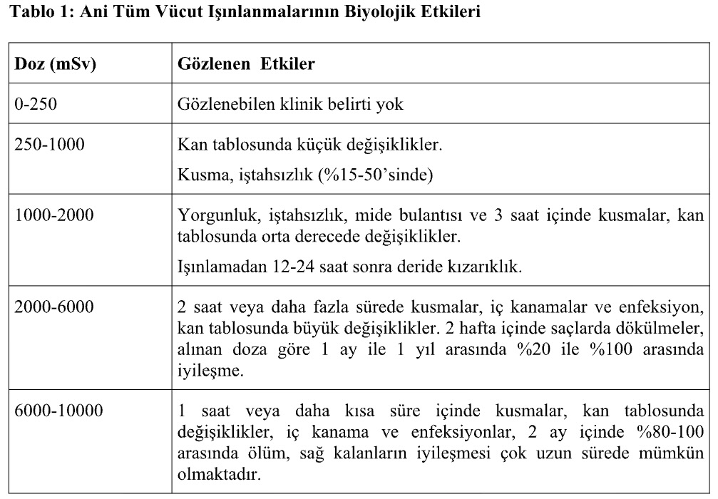 Büyük ani dozların biyolojik etkileri aşağıdaki gibidir: