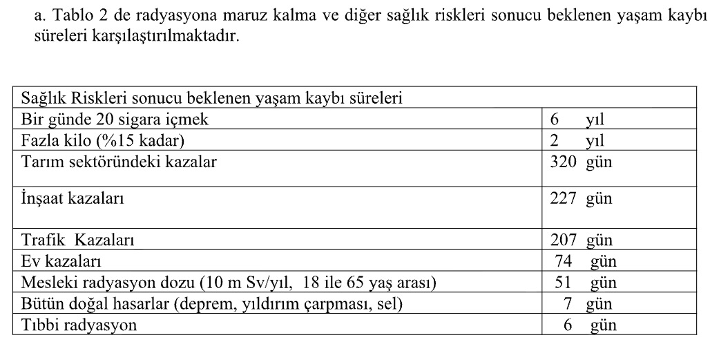 Tablo 2’deki hesaplamalardan mesleki radyasyonun sağlık riskinin normal günlük aktivitelerimiz dolayısıyla maruz kaldığımız risklerle karşılaştırıldığında oldukça düşük olduğu  gözlenmektedir.
