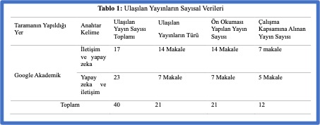 Yapılan literatür taramasında, Dergipark ve Academia benzer ve sınırlı sayıda sonuçlar verdiği için çalışmaya dahil edilmemiş, sadece Google Akademik veri tabanı kullanılarak yapılmıştır. Farklı veri tabanları (wos veya scopus vb.) İngilizce diliyle yayın yaptıkları için çalışmaya dahiledilmemiştir. Çalışmada anahtar kelimeler kullanılarak 2019-2024 yılları arasında yapılan taramada toplam 40 adet yayın olduğu tespit edilmiştir. Bir eserin birden çok listelenmesi (tekrar) ve tez, bildiri, kitap bölümü gibi yayınların sayılarının az olması nedeniyle kapsam dışı tutulmasına karar verilmiştir. Geriye kalan 21 yayın incelemeye alınmıştır. Taramanın yapıldığı yer, yayın sayısı, yayın türleri ve incelemeye alınan toplam makale sayısı aşağıdaki Tabloda ayrıntılandırılmıştır.