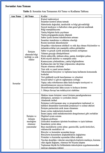 Çalışmanın analizinde yapılan okumalar ve temel kodlamalar sorasında iki ana tema ve üç alt tema belirlenmiştir. Elde edilen veriler bulgular başlığında iki ana tema, alt temalar ve kodlamalarla birlikte görsel hale getirilerek tablo şeklinde sunulmaktadır. Bulguların sunumunda “araştırmacı kendi görüş ve yorumlarına yer vermeden toplanan verileri işlenmiş bir biçimde okuyucuya sunar” (Yıldırım ve Şimşek, 2018) ilkesi dikkate alınmıştır. Bu ilkeye uygun olarak çalışmanın bu adımında elde edilen veriler yorum katılmadan tablolar yardımı ile sunulmuştur. Ana temalardan ilki Sorunlar olarak adlandırılmıştır. Alt temalarda İletişim alanında bilgi kirliliği ve etik riskler ile İletişim ve iletişim mesleğine olumsuz yansımalar yer almaktadır. Ana temadan ikincisi ise Çözüm Önerileri şekline adlandırılmıştır. Alt tema İletişim alanında insan kontrolü, yasal düzenleme ve denetlemeler olarak belirlenmiştir.