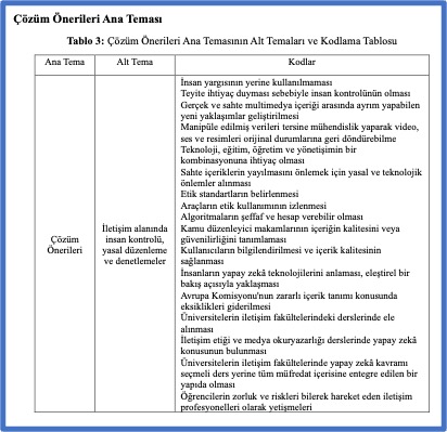 Gelişen dijital teknolojiler ve yapay zekâ sistemlerinin karşısında bireyin güçlü kalabilmesi için geliştirilen öneriler de bulgulanmıştır. Buna göre teknoloji, eğitim, öğretim ve yönetişimin bir araya getirildiği bir yapının oluşturulması önerilmektedir. Yapay zekâ sisteminin etik kullanım kodlarının belirlenmesi ve izlenerek denetlenmesi, bunun yanında şeffaflık ve hesap verebilirliğin sağlanması öneriler arasında yer almaktadır. Bireyler için öneriler arasında kullanıcıların yeterli düzeyde bilgi sahibi olmasının sağlanması ve içerik kalitelerinin iyileştirilmesiyle, kullanıcıların yapay zekâ teknolojisini anlamaları, eleştirel bakış açısıyla yaklaşmaları ve etik değerleri gözetmeleri sağlanabilecektir. Denetleyici kurumların içeriğin kalitesini veya güvenilirliğini tanımlaması, bunun yanında hukuk ve yapay zekâ konusunun tartışmalara açık olması istenmektedir. Kırık ve Özkoçak (2023) bu durumla ilgili olarak hukuki ve etik açıdan ülkelerin ortaklaşa hareket etmesinin son derece önemli olduğunu vurgulamaktadır. İletişim alanı bağlamında yapay zekâ sistemlerinin iletişimciler tarafından kavranması, iletişim fakültelerinde derslere konu edilmesi hatta tüm müfredat içerisine entegre edilen bir yapıda olması iletişim etiği ve medya okuryazarlığı derslerinde yapay zekâ konusunun bulunması sıralanmaktadır. İletişim alanındaki bu öneriler yerine getirildiğinde zorluk ve riskleri bilerek hareket eden iletişim profesyonellerinin yetişmesi sağlanacaktır (Demirel, 2023, s.10). Bu alt temada yer alan tüm çözüm önerileri ortaya çıkan sorunların giderilerek sorunların azaltılmasına katkı sağlayıcı niteliktedir.