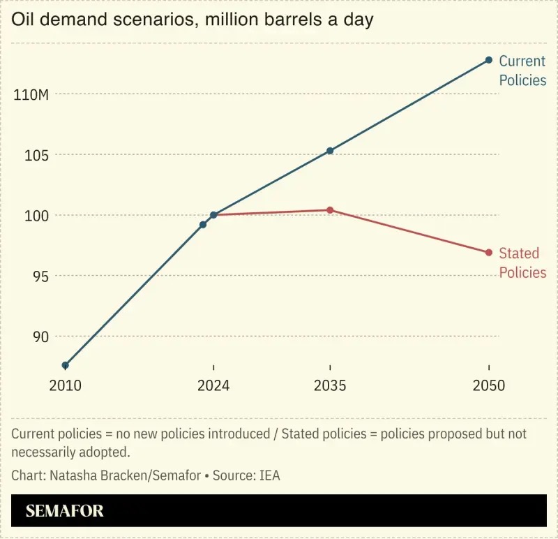 IEA’nın petrol talebi senaryolarını gösteren grafik.https://www.semafor.com/article/11/13/2025/the-next-fossil-fuel-showdown-is-brewing-at-cop?utm_medium=net+zero&utm_campaign=flagshipnumbered1&utm_source=newslettercta