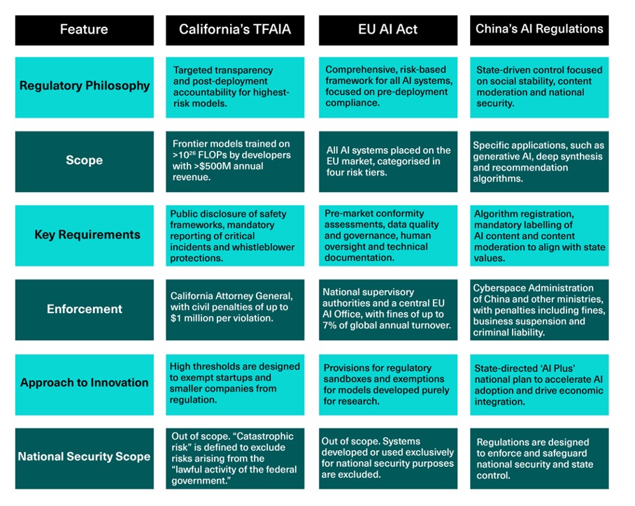 Hem Kaliforniya yasası hem de AB Yapay Zeka Yasası, yapay zeka riskini yönetmeyi amaçlasa da, temelde farklı felsefeler üzerine kuruludur. AB yasası, piyasa öncesi ağır uyumluluk yükümlülükleri getiren geniş kapsamlı, risk temelli bir çerçeve iken, TFAIA, kamuya açıklama yoluyla hesap verebilirliği önceliklendiren dar kapsamlı, dağıtım sonrası bir çerçevedir.