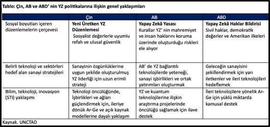 UNCTAD Dijital Ekonomi Raporu 2021’e göre dijital ekonomide temel üç düzenleyici yaklaşım bulunmaktadır. Çin tarafından tercih edilen yaklaşım, ulusal hedeflere ulaşmaya destek olmak için sıkı düzenlemeler yaparak doğrudan müdahale etmektir. AB temel haklar ve değerleri korumayı amaçlayan güçlü düzenlemeleri yeğlemektedir. Üçüncü yaklaşım ise, ABD tarafından izlendiği üzere, esnek bir düzenleme çerçevesi oluşturmak yönündedir. Ancak YZ’ nin son yıllardaki gelişimi ve gerek toplumsal gerekse ekonomik etkileri sonucunda son yıllarda ülkelerin stratejilerinde benzerlikler artmıştır. Söz konusu yaklaşımlara ilişkin esaslar UNCTAD tarafından tablolaştırılarak özetlenmiş olup, geleneksel farklılıklarına rağmen Çin, AB ve ABD’ nin artan oranda ortak yaklaşımlar gösterdiğine işaret edilmektedir.