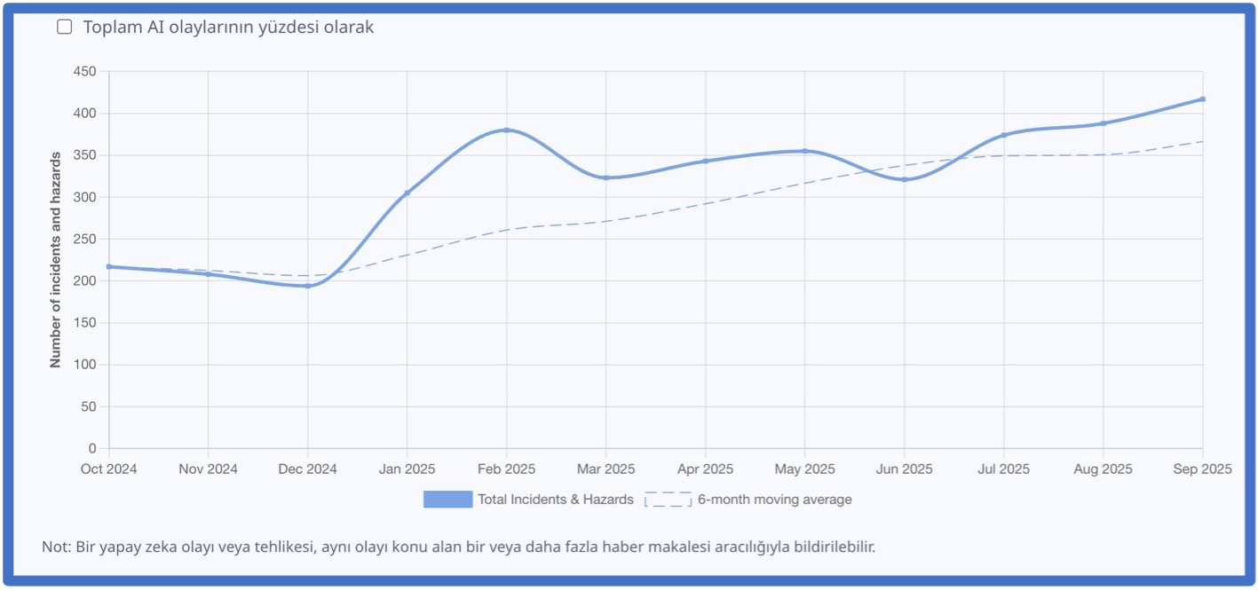 • Yapay zeka destekli psikolojik zararlar : Yasal davalar, yapay zeka sohbet robotlarının gençlerin kendine zarar vermesinde rol oynadığını iddia ediyor ( Kasım 2023 , Şubat 2024 , Nisan 2025 ). Bunlar sistematik izleme yerine yalnızca davalar aracılığıyla görünür hale geldi.
