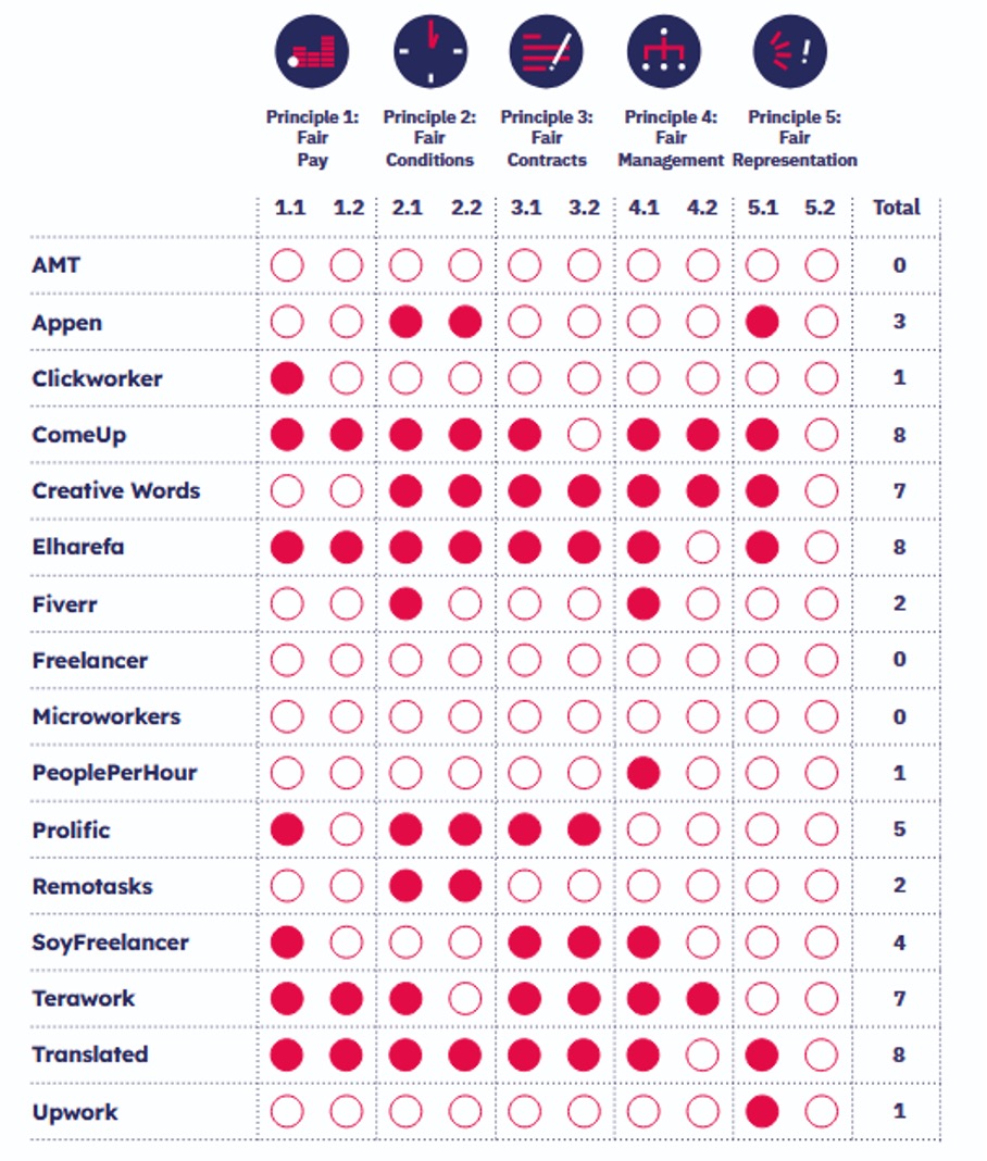 Mechanical Turk ve Freelancer 10 üzerinden 0 puan aldı. Fiverr 10 üzerinden sadece 2 ve Appen 10 üzerinden sadece 3 puan aldı. Sadece dört platformun çalışanlarına yerel asgari ücrete eşdeğer ücret ödediği bulundu.